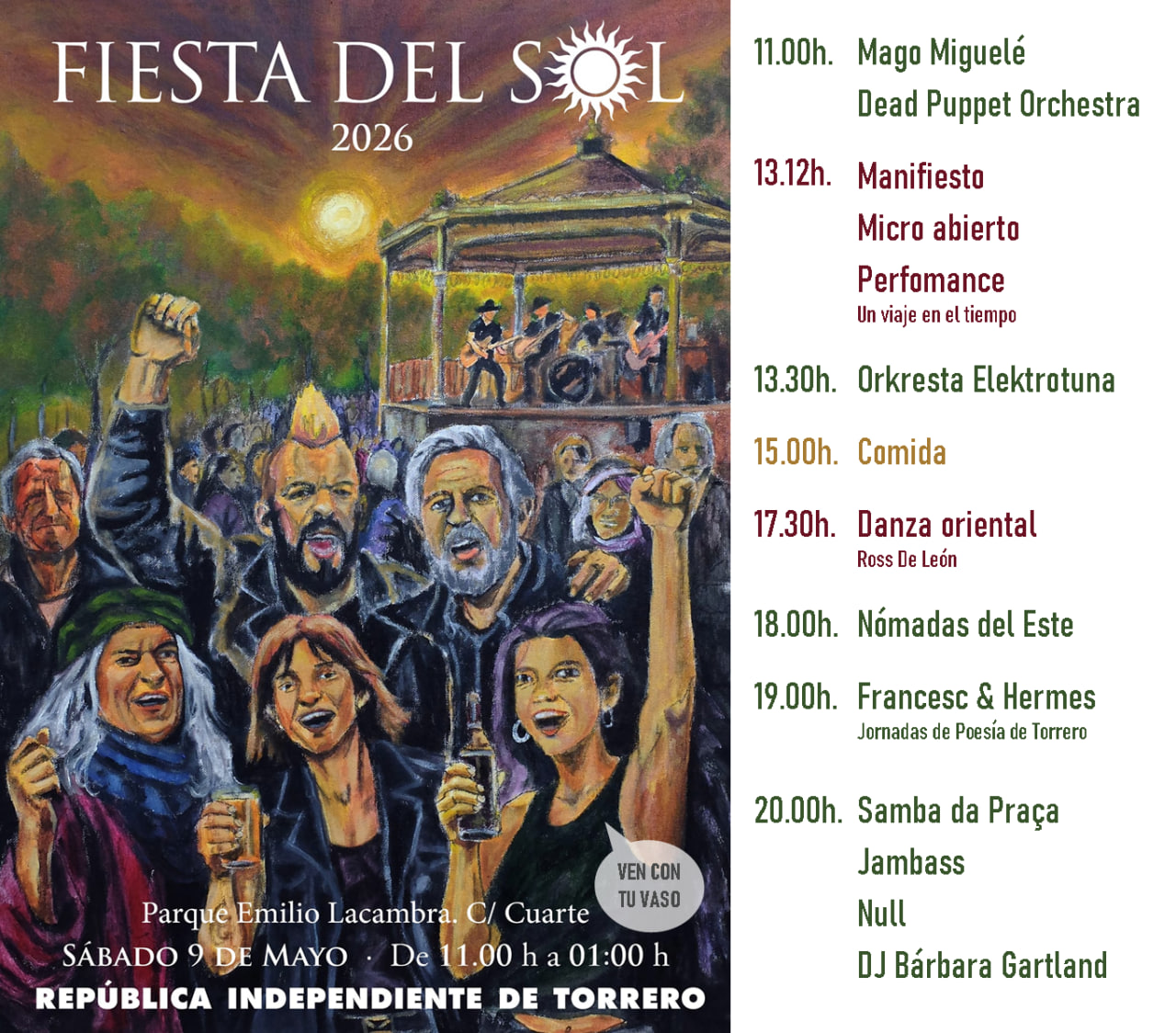 El sábado 9 de mayo, la República Independiente de Torrero celebra una nueva edición de la Fiesta del Sol en el Parque Emilio Lacambra. Veinticuatro años llenando el barrio zaragozano y la ciudad de reivindicación, cultura comunitaria y solidaridad, con actividades para todos los públicos, música, muestras de artesanía y mesas informativas de colectivos.
