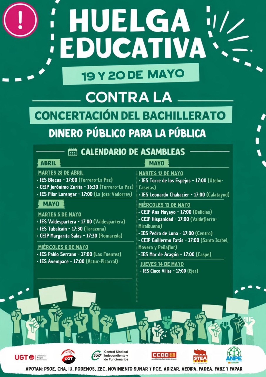 El calendario de movilización culminará con una huelga educativa en Aragón los días 19 y 20 de mayo, en la que están llamados a participar profesorado, alumnado y familias. La convocatoria se plantea como una respuesta unitaria a una decisión que consideran “injusta” y que, denuncian, relega a la escuela pública.