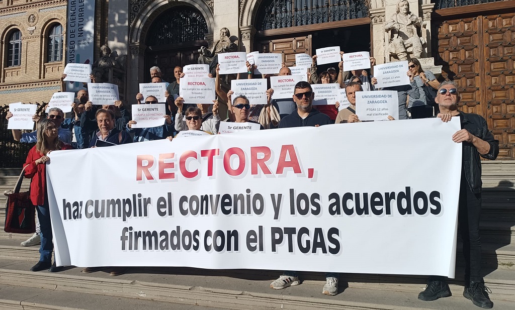 El sindicato SOMOS y representantes del Personal Técnico Especialista de Laboratorios y Talleres de la Universidad de Zaragoza se concentró en la mañana de este pasado martes en las escaleras del Paraninfo de la Universidad “para reclamar a la rectora que haga cumplir los acuerdos de su Consejo de Gobierno, concretamente el celebrado en marzo de 2025, en el que se acordó la implementación del Grupo B para todo este personal técnico”.
